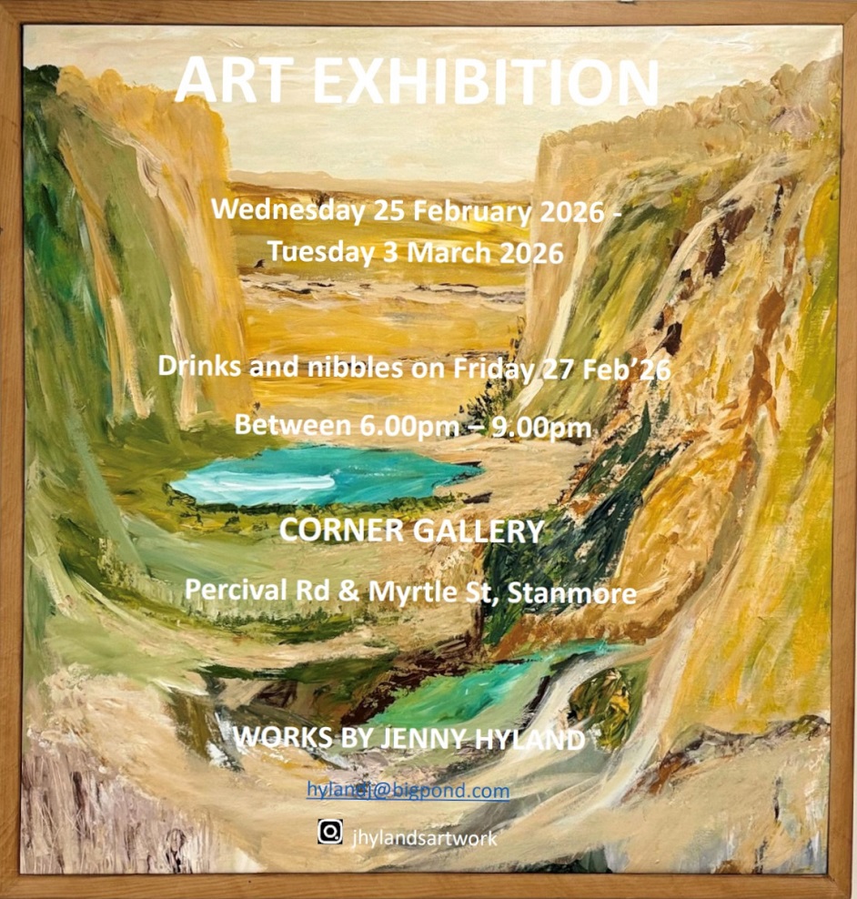 On at the Corner Gallery from 25th February to the 3rd March, 2026. Opening drinks on Friday, 27th from 6pm to 9pm. For more information Jenny can be contacted...