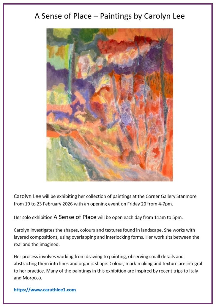 Our next event here at the Corner Gallery from the 19th to 23rd February, – Paintings by Carolyn Lee.