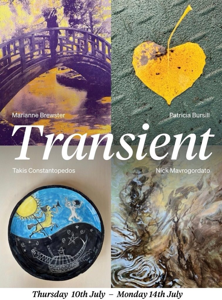 ‘Transient’ – A group exhibition, – artworks by Marianne Brewster, Patricial Bursill, Takis Constantopedos and Nick Mavrogordato, on at our Gallery from 10th to 14th July.